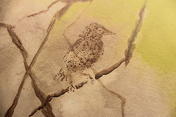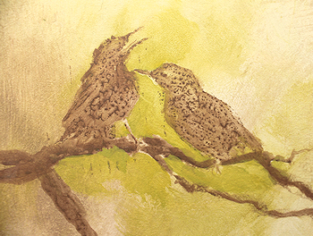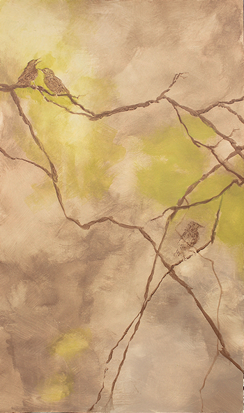 This has served as my head dressing for, well, longer than I'd like to admit. My hair has a permanent ridge over the top of my head. Let's just say that I could have received a degree in the amount of time it's taken me to complete this audiobook. The actual performance of it came relatively easily, even though it had been decades since my last bonifide acting job. (My formal training was in the theatre. It wasn't until much later that I sought formal visual art training.) No, the time it took to complete the finished recording of "The Topsail Trek" (authored by JT Kalnay) was due to my lack of training in audio engineering. I needed to LEARN IT ALL before uttering a single word into the microphone. Could I do it? I knew I wanted to. I knew I needed to. But it would take time, perseverance and patience. The problem for me was that there was no tutor, no human being to answer my questions as I went along - only the internet (forums, youTube pros, advice sites) and phone calls and emails to audio equipment retail salespersons and manufacturer reps. I went through 3 microphones, 2 interfaces (the hardware that converts analog to digital) and test drove at least a half dozen DAWs (Digital Audio Workstations - the recording and editing software). I added other hardware (a preamp and gain booster) to my recording chain along the way as well. Tested each, trying to remove whatever new noise each piece was adding to my signal, trying to determine if it was worth the new noise. All of those impediments (including, of course, my internal natural mouth noise while speaking closely into the mic) had to be removed with my software - which, in itself, required much study, testing and implementation. After all of that, right about Chapter 100 (this book has 125 chapters) I think I got it all to work nominally well. Once I was able to click the "I'M DONE" button on my upload page on the ACX site, I felt as if I'd given birth to a 400-pound gorilla. As with all baby gorillas, they're lovable and cuddly, but still kind of primative. And so it goes with this mammoth undertaking. It's been intense. I have lived through many things in the course of this endeavor (not the least of which was cancer treatments), but it was worth it if for no other reason than to simply see it through. The final product is far from perfect, but I know I gave it my best. I know I still have much to do to improve my recordings, but at some point, I feel as though I'll be able to somewhat confidently add this to my skillset as an artist, mixed in with my painting, writing and everything else. I want to use it all while it's still there and I'm still here. As corny as it sounds, I do feel a certain healthy glow having pursued something new and challenging and coming out the other side relatively unscathed. Speaking of survival, and if I haven't worn out my welcome, there's a little more about how this diversion toyed with my soft underbelly in the NOTIONS section =========> OCT 25, 2018: My idea for the panel images was to have them blend into the environment - something familiar from nature, something specific to this place. From earliest spring to mid summer, the haunting mating song of the male wood thrush wafts through the trees on any given day. When the bird is close by, the subtleties and complexities of that song are so engaging that it stops me in my tracks to listen. I was so inspired by it, years ago I carved its likeness into three print blocks, not yet knowing where I'd use them, if ever. ![]() ![]() Not wanting to spend a bunch of time on this project, I remembered those print blocks and decided to use them here. I wanted the panels to be sort of stylized anyway, so I thought this would be a perfect use for them. What I learned, though, was that using acrylic paint for the print block medium just plain doesn't work right (you're supposed to use ink or screen printing paint). <![]() The acrylic paint tends to pull back onto the print block when it's removed, leaving a sort of bead effect. If I'd used less water in the mixture, it might have worked better, but in the end, it gave it kind of an interesting ethereal effect that seemed appropriate in this case (wood thrushes are normally heard and not seen). At least that's how I justified it. The two south window panels turned out quite a bit different than the first, which was okay since they wouldn't be seen from the same plane from the outside. I worked on both of them at the same time, setting up two easels side by side. ![]() <-------------------------------------------------- 56.5" --------------------------------------------------> Since the branches turned out a bit less stylized, I decided to be a little more representational with the birds - first stamping their images with the print blocks for guidance, then painting them in. ![]() ![]() Pulling colors from the background onto the birds was my attempt to blend them into the scene. I think it worked to some degree. The foam core itself was not dense enough to fully block out light, so I put a couple of layers of gesso on them first. Unfortunately, since gesso is a size as well as a ground, the first panel severely cupped after drying. I had to put weights on the back for a couple of days, which helped a bit, but didn't quite do the trick, so I gessoed the back side and it corrected the bow well enough. I decided to try to use this idea on the other two panels by putting a coat of gesso on each side right off the bat. It worked beautifully - the size on each side counteracted the other, leaving the board perfectly flat. In case I didn't mention it before, the images are seen from the outside. After first inserting them into the windows, I went outside to see how they looked. What I didn't count on was the fact that the windows have a UV protectant in the glass. This isn't visible from the inside, but, looking from the outside in, anything behind those windows is darkened. My panels were barely visible! What's kind