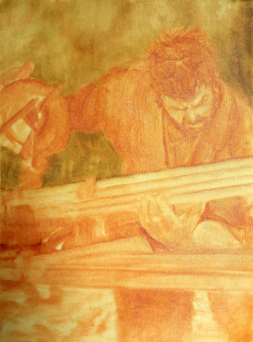 The canvas is fairly large. My subject includes mangoes, kiwis, a plum, plate, wooden flute and incense burner. The background is very dark so I thought I'd try my hand at what I've read of Rembrandt's glazing technique to try to capture the infinite depth he managed to achieve in his paintings. I started with a fast-drying Gamblin medium mixed with a dab of a warm, transparent color. To be honest, I didn't care for the "gumminess" of the medium as I worked it into the canvas. I suppose it's manufactured that way to make it dry quicker, but it started to dry on one section of the canvas as I worked on another part. When it came to blending the mass together, it, well, wouldn't. Another problem was streaks. Even after 5 or 6 layers of the transparent paint, the streaks still showed. (I guess I should've used softer bristles.) So I mixed a bit of an opaque warm into the recipe in an attempt to subtlely cover them (over the right 1/2 of the background). Big mistake. It immediately ruined the illusion of depth as if I had thrown a dark, brown blanket in front of it. The thing is, once you've used an opaque, it can never again be "transparent". So, I'm hoping the tour guide at the MIA will relate some Rembrandt words of wisdom to get me out of this mess. SEPT 2, 2012: Here's a closeup of a painting I'm revisiting. Better said, attempting to "save".